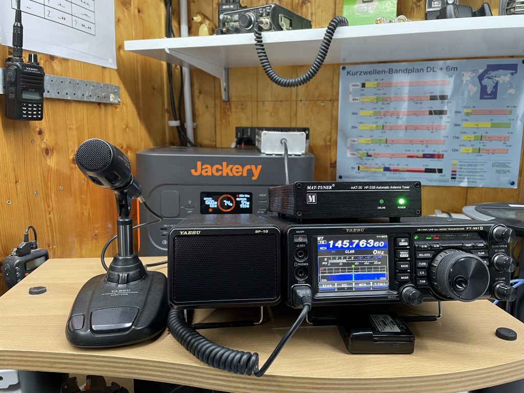 Im Schack betreibe ich zur zeit nur ein Yaesu FT-991a, dies Gerät ist ein All in One wunder. Recht kompakt beherrscht es VHF/UHF mit 50w und die Kurzwelle mit 100w. Ein Tuner und Digitaler betrieb ist auch noch im Recht kompakten Gehäuse. Das wird dann noch durch viel Konnektivität abgerundet, durch die USB Schnittstelle wird der betrieb mit SSTV oder FT-8 ein Kinderspiel.